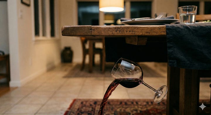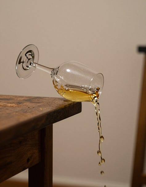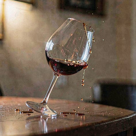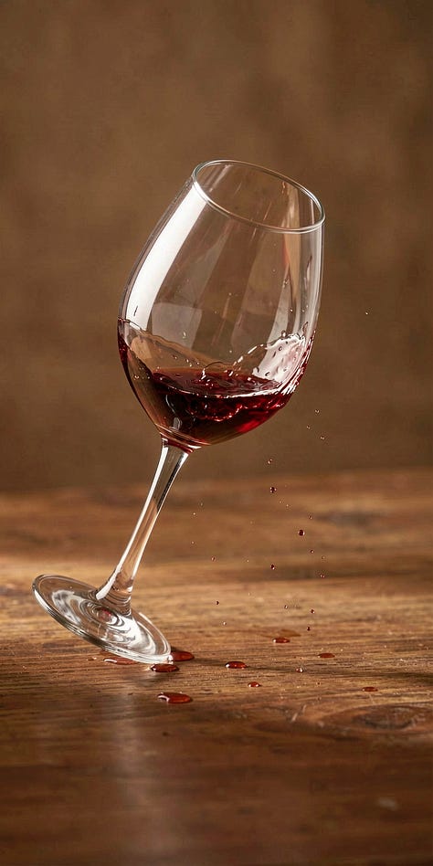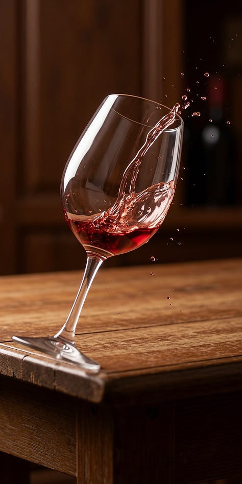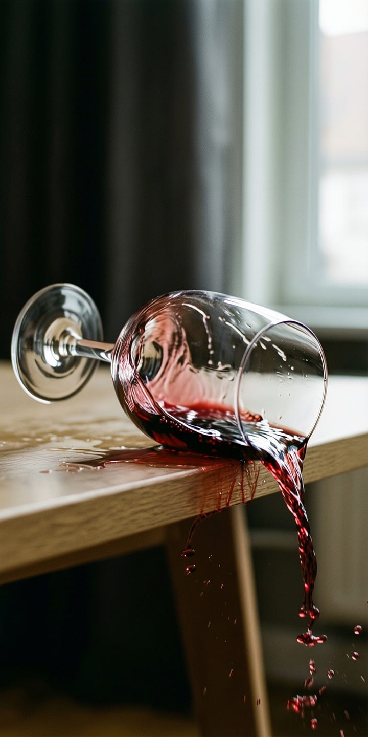 Prompt: A wine glass that has just been knocked off a table, captured 0.5 seconds after leaving the edge. The glass should be tilted at a realistic angle for its falling trajectory, with wine beginning to spill out following gravity but not yet scattered.