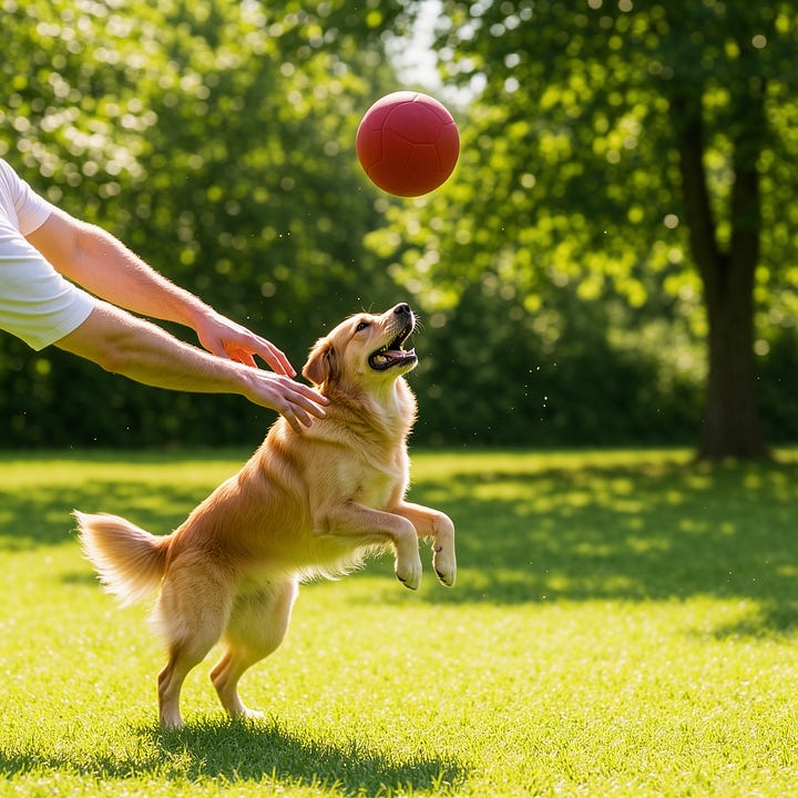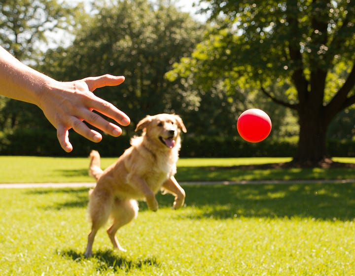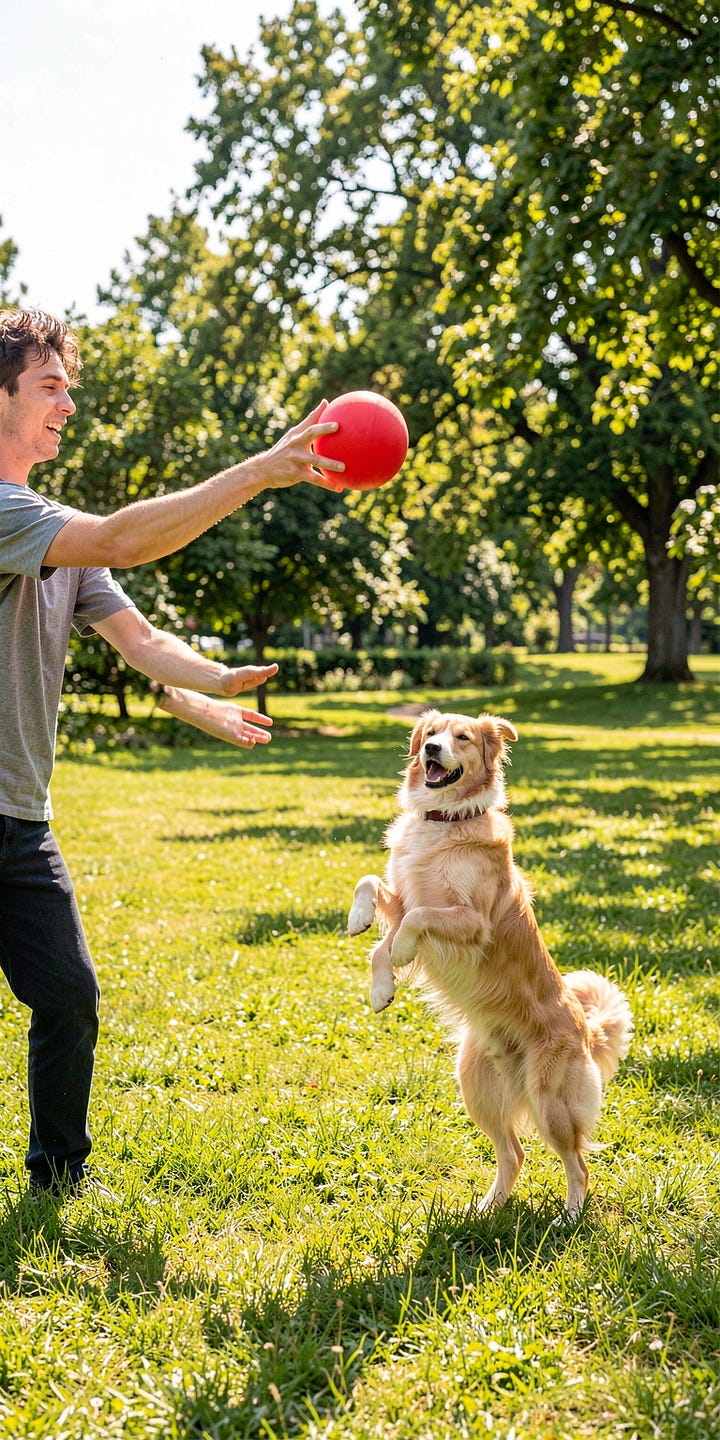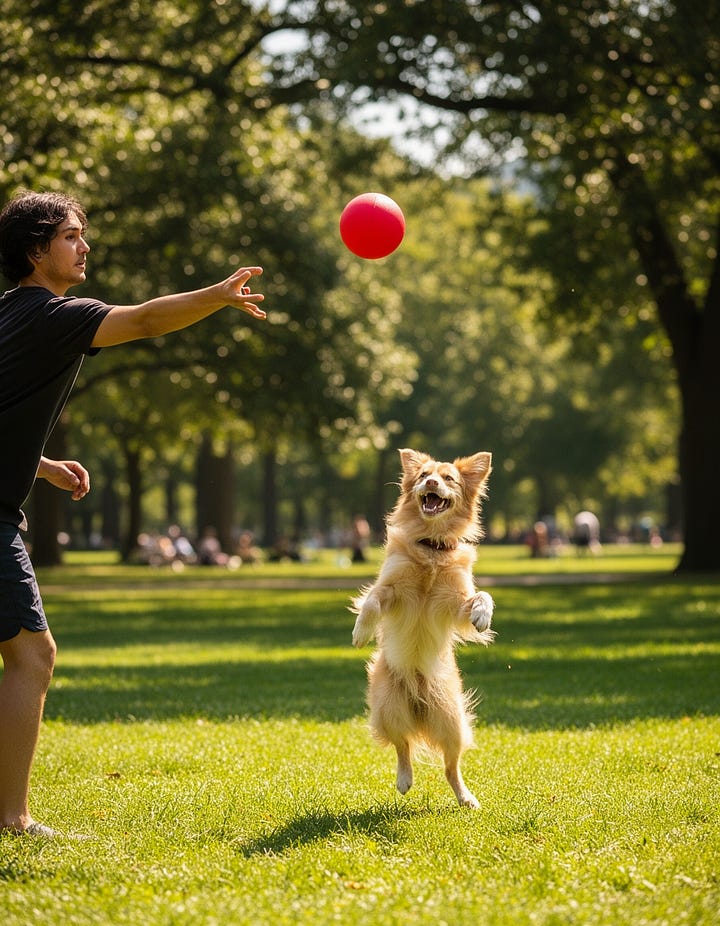 Prompt: A person throwing a red ball to a dog in a sunny park. The ball is in mid-air between the person’s extended arm and the jumping dog.
