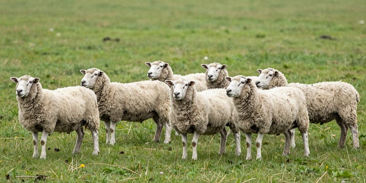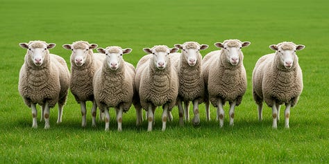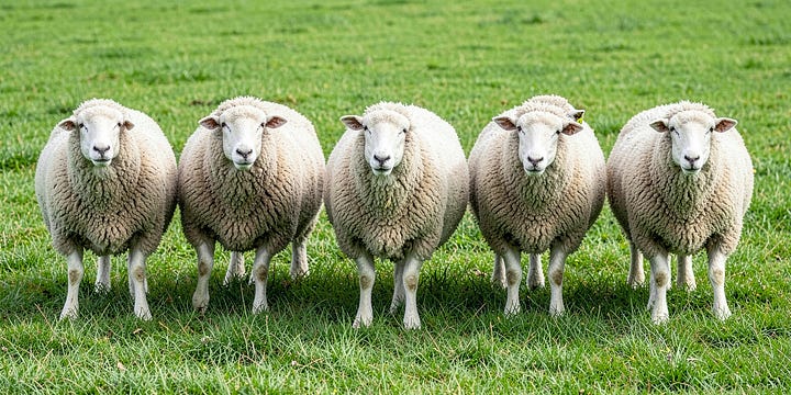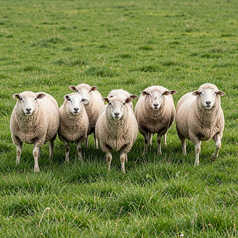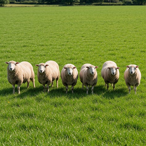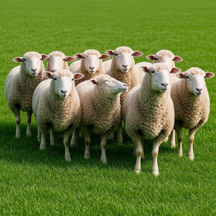 Prompt: A realistic photograph of exactly 7 sheep standing on a green field, each sheep fully and clearly visible and individually countable.