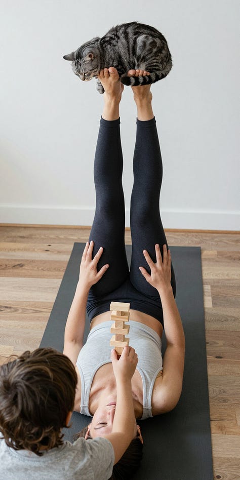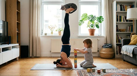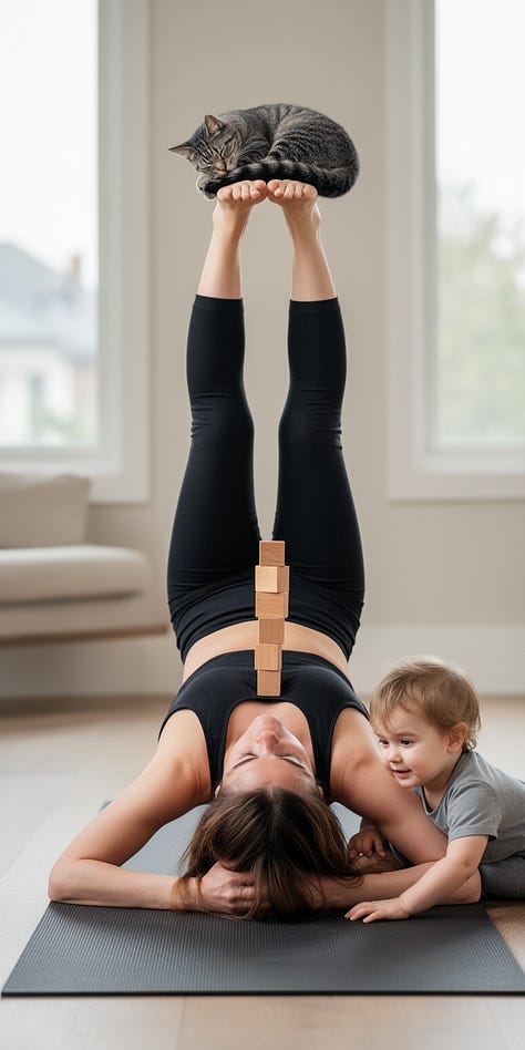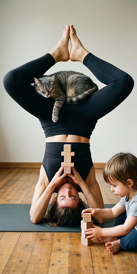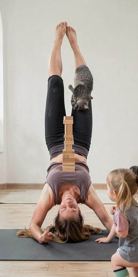 Prompt: A wide-angle realistic photo of a woman holding a steady yoga headstand on a mat. A grey tabby cat is curled up sleeping on her vertically upturned feet, while a small child in the foreground is carefully stacking a precarious tower of three wooden toy blocks on the woman’s horizontal stomach. The scene requires a clear void between the woman’s torso and the floor, with distinct points of contact for both the cat and the blocks.
