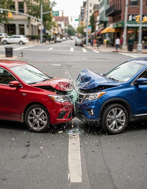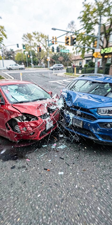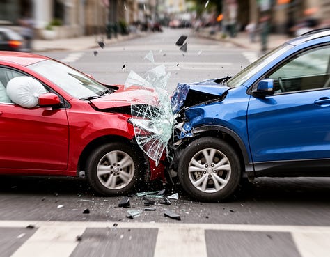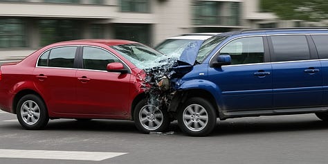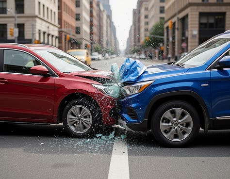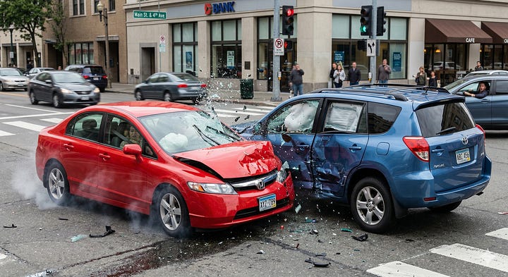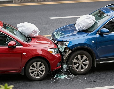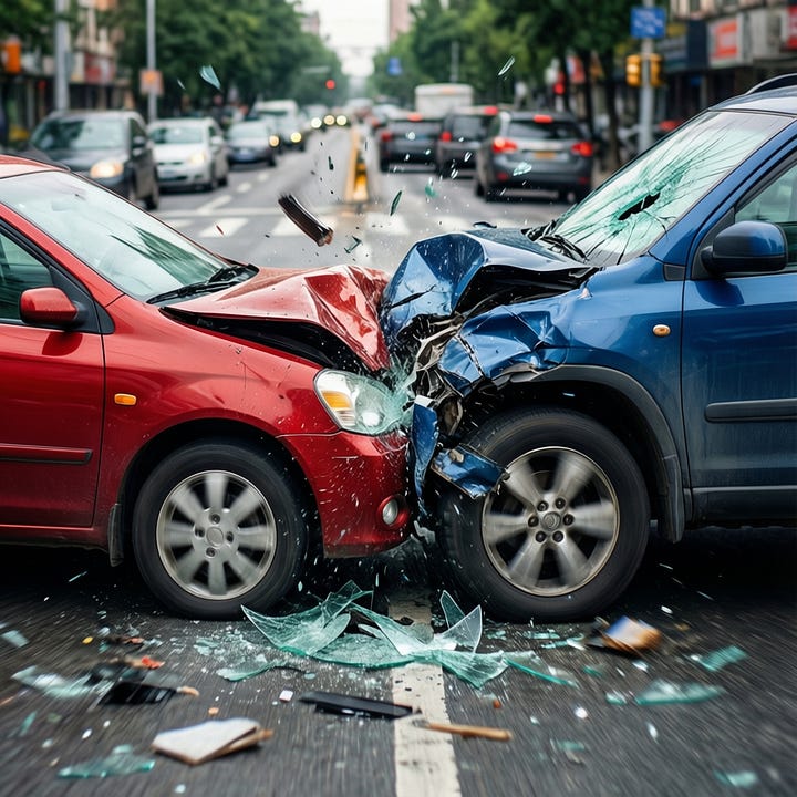 Prompt: The exact moment of collision between two cars in an intersection. One red sedan T-boning a blue SUV. The image must show: both front airbags deploying, broken glass mid-shatter, the deformation of metal, and appropriate motion blur on debris.
