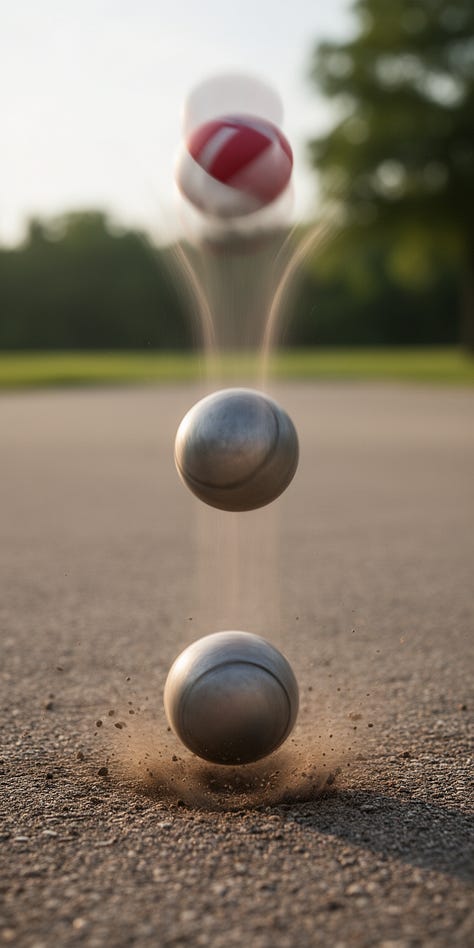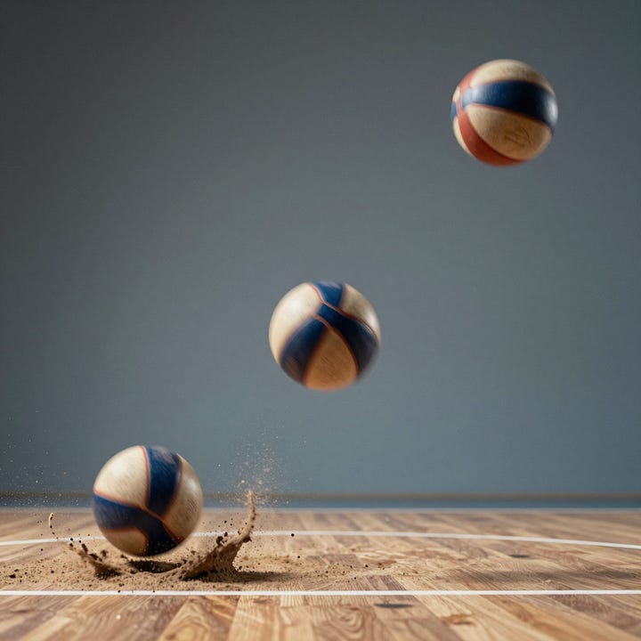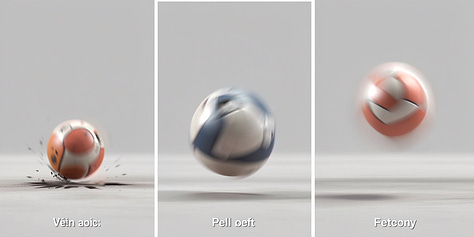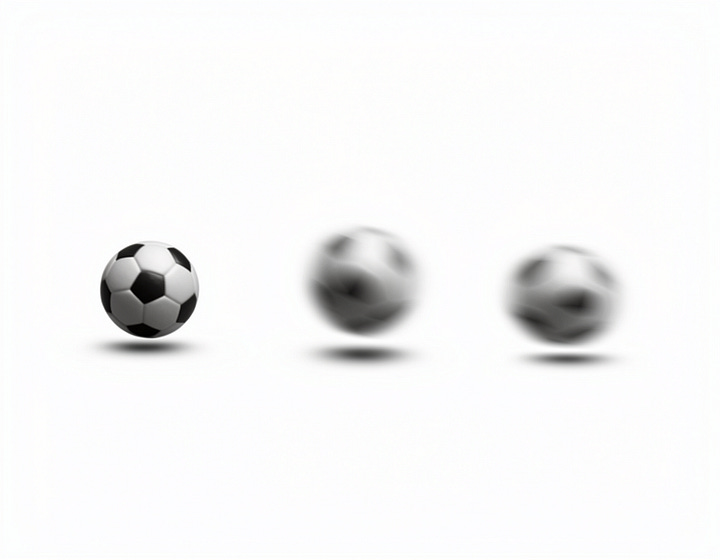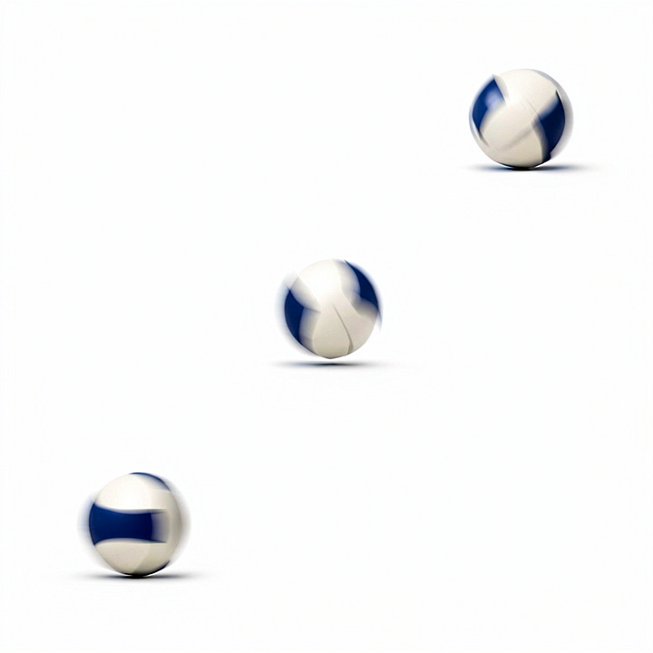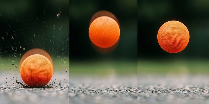 Prompt: A ball bouncing, shown at three points in its trajectory: the moment of impact with the ground (slightly compressed), mid-bounce upward, and at the peak of the bounce. Motion blur should be appropriate for each stage.