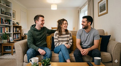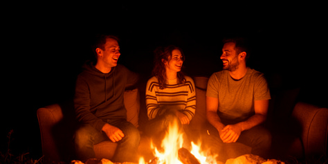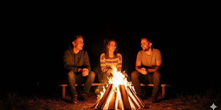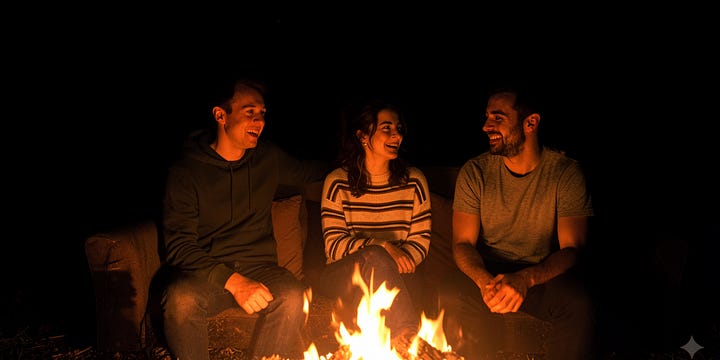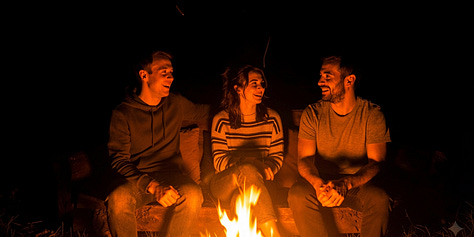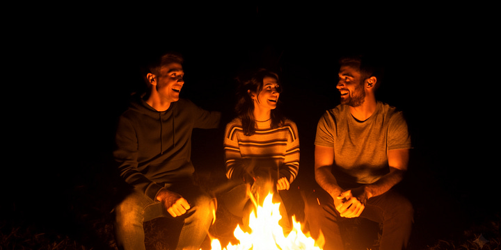 Prompt: Relight the entire scene to place them outdoors around a campfire at night. The only light source should be the warm, flickering orange glow of the fire coming from below their faces. This should create strong upward-casting shadows (under brows, noses, and chins) and illuminate the texture of their clothing from beneath, while keeping the background pitch black.