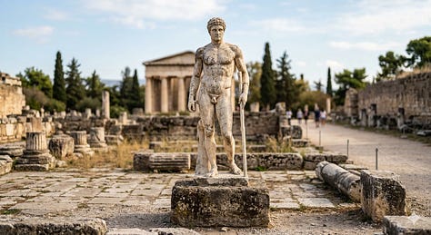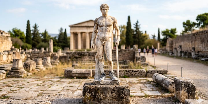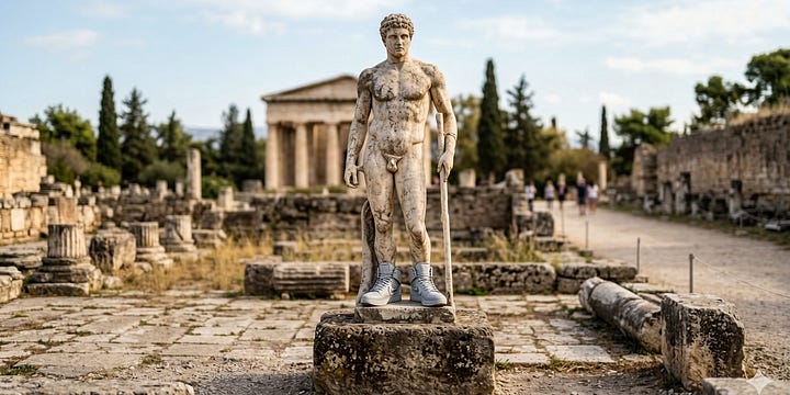 Prompt: Edit the statue’s feet to be wearing detailed, modern high-top basketball sneakers. The sneakers must appear to be carved entirely from the same block of aged marble, matching the stone texture, color, and weathering of the rest of the statue.