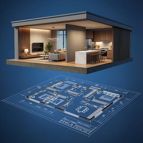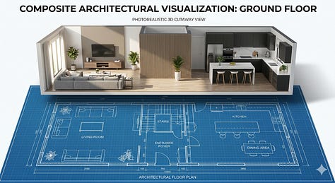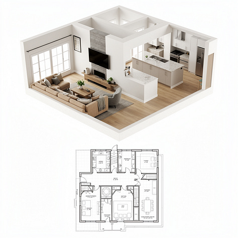 Prompt: A composite architectural visualization. The top section shows a photorealistic 3D cutaway view of the ground floor of a modern house, revealing a furnished living room (with sofa and TV) and a kitchen (with an island) separated by a partial wall. This 3D model hovers directly above a matching 2D architectural blueprint floor plan of the same level with perfectly aligned layout.