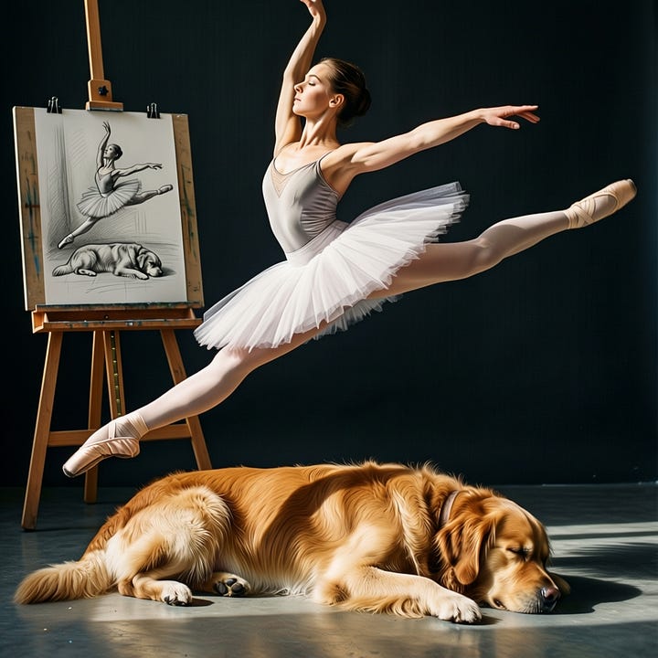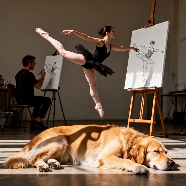 Prompt: A realistic, high-shutter-speed photo of a ballet dancer performing a graceful high jete leap directly over a sleeping golden retriever. In the background, an artist at an easel is sketching the exact scene onto a canvas. The dancer’s shadow must fall realistically across the dog’s fur, and the sketch on the canvas must visibly mirror the dancer’s pose.