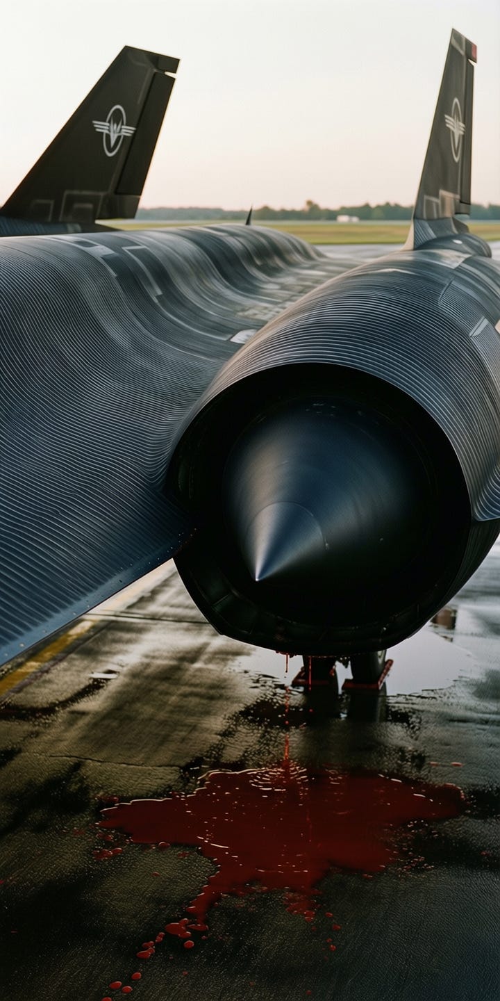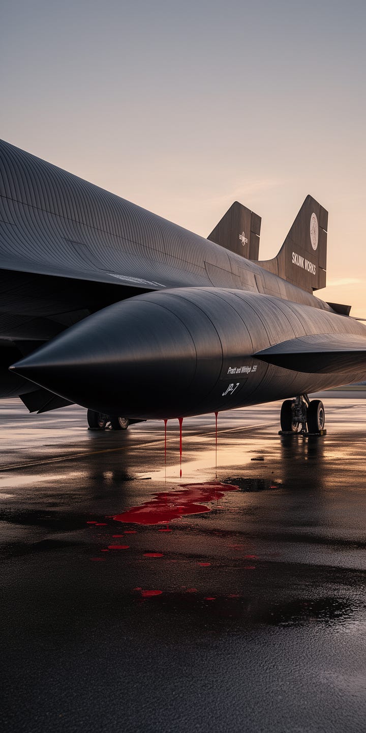 Prompt: A cinematic low-angle shot of a Lockheed SR-71 Blackbird on a wet tarmac at dawn. The image must capture the corrugated, ribbed texture of the matte-black titanium skin. The focus is on the Pratt and Whitney J58 engine nacelles, featuring the sharp, conical movable intake spikes. Small puddles of red JP-7 fuel are visible leaking onto the ground beneath the fuselage, reflecting the Skunk Works logo on the tail fins.