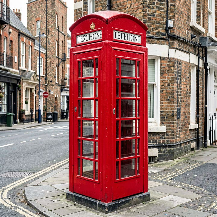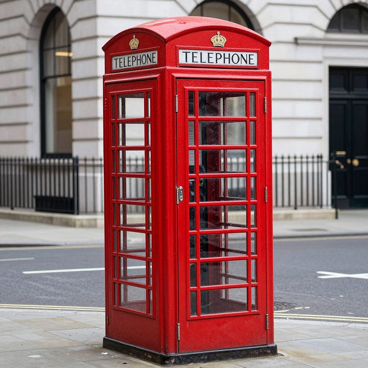 Prompt: A photo of a classic red British telephone box K6 model on a London street corner. The box should feature the distinctive crown emblem at the top and the correct multi-pane glass windows.