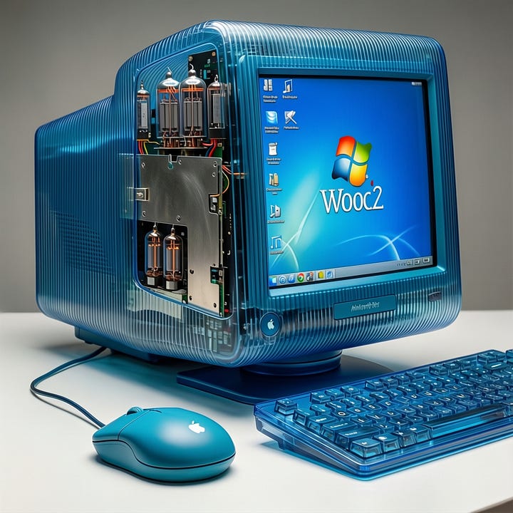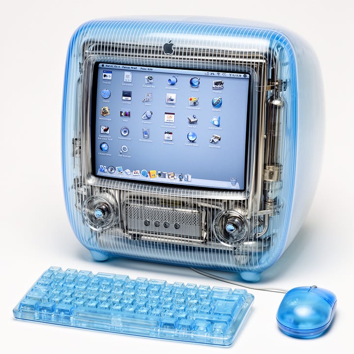 Prompt: A high-resolution product photo of a 1998 Apple iMac G3 in Bondi Blue. The shot emphasizes the translucent pinstriped plastic casing, clearly revealing the internal metal CRT shielding and vacuum tube components through the shell. It includes the matching hockey puck circular mouse and the translucent keyboard. The active screen displays the Mac OS 8 desktop with classic Platinum-style icons.