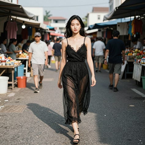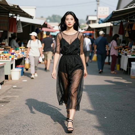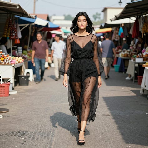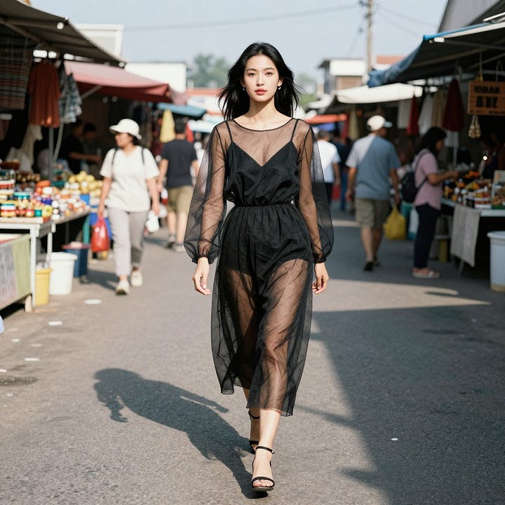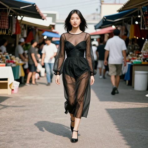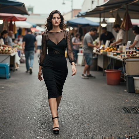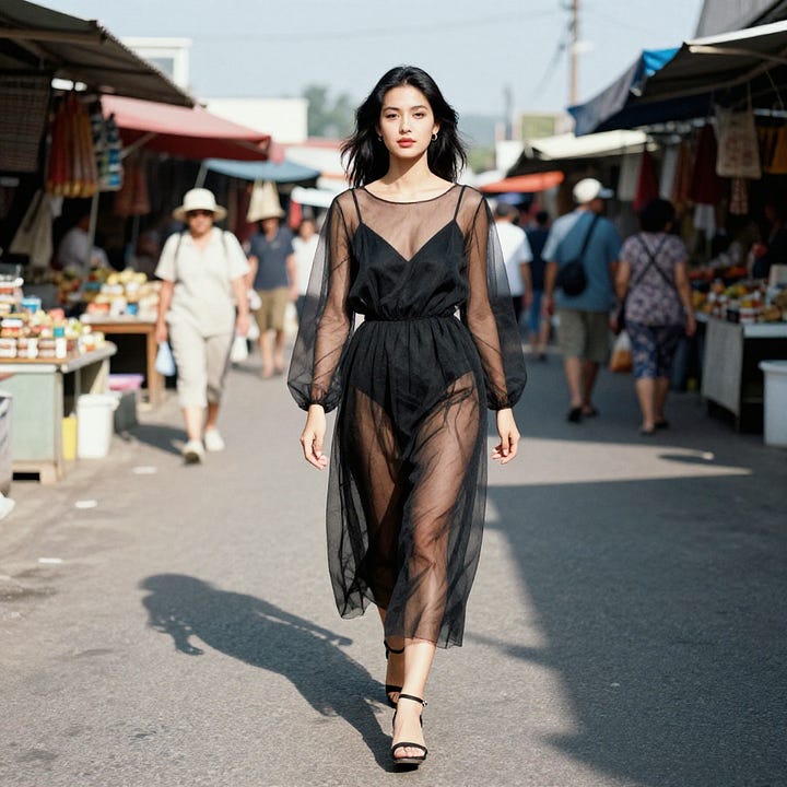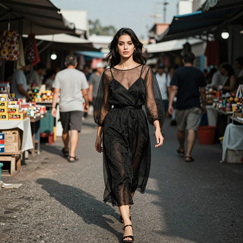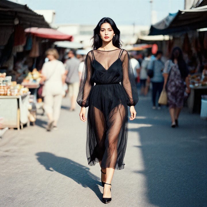 Prompt: 35mm analogue full-body portrait of a beautiful woman wearing black sheer dress, catwalking in a busy market, soft colour grading, infinity cove, shadows, kodak, contax t2
